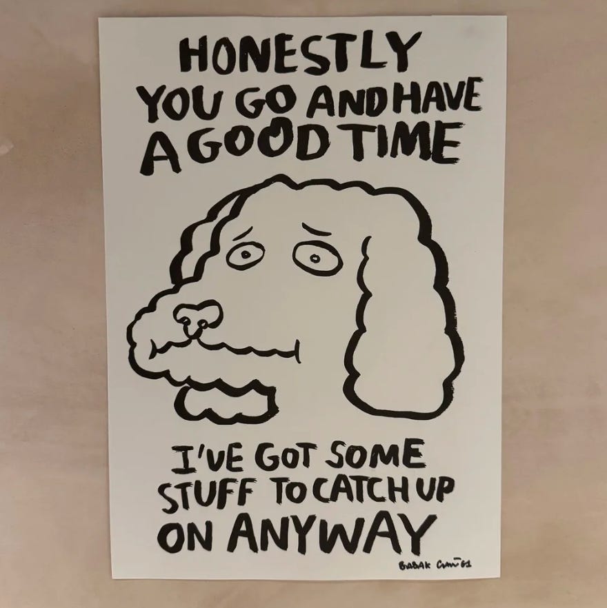 My dear friend Babak Ganjei, an artist, has recently started selling his passive-aggressive pet prints. They make me laugh so much. Here’s one. It is a picture of every dog I have ever met: